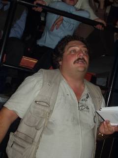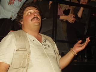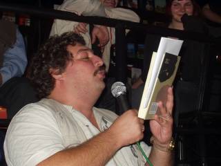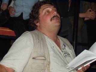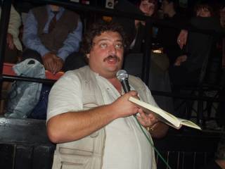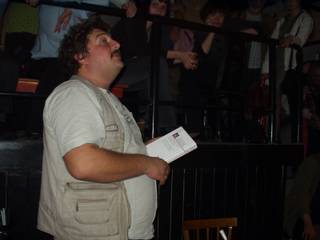 После чего Дмитрий Львович Быков исполнил фрагменты своего романа «ЖД». Это на самом деле было исполнение. Сначала был фрагмент, в котором атаман варягов слушал вавилонскую песнь бродячего певца, которую Дима исполнил один в один, то есть в певческом экстазе. Итак, кроме профессиональной деятельности поэта, прозаика, критика, публициста, телеведущего, импровизатора, Дима еще стал и большим артистом. Читает изо всех сил, всей своей энергией, на высшей ноте. Впечатление потрясающее. Второй фрагмент был о пребывании писательской бригады патриотов на фронте. Третий, - чтобы дать равновесное представление о тексте, - а речь об охватившей Россию гражданской войне между варягами-патриотами и хазарами-либералами, - о том, как хазары входят в деревню, где хазарянин Эверштейн (не путать, как сказал Дима, с присутствующим здесь Эдельштейном, к которому герой романа не имеет отношения) высказывает свои либеральные взгляды. Не удивительно, что роман уже назван русофобским и антисемитским. Алексей Костанян, сидевший рядом, вовсе отвернулся, глядя в противоположную Диму стену, а потом и вовсе поднялся на лестницу, чтобы вовсе не иметь к происходящему касательства. Публика тоже, сперва помиравшая со смеху, притихла.