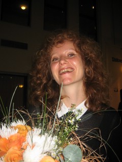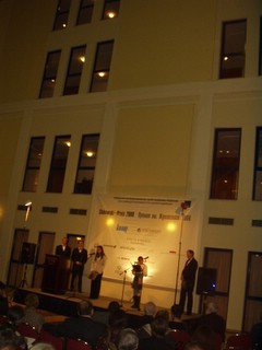 Остальных сотню-полторы людей видели в первый раз в жизни. Или немцы, или люди, очень на немцев похожие. Но тоже для разнообразия хорошо. Сначала была официальная часть, на которую мы на полчаса опоздали, и я, конечно, всю дорогу ругался, дулся, шел быстро, но Галя, как всегда, оказалась права, - можно было опоздать и на час. Были, как водится у немцев, «модератор», «лаудацио» - что это такое, не знаю, и даже зеленый фрукт, который Галя возьмет потом из корзины, непонятно как будет называться, но не лайм. Саша Ливергант сказал, что премия очень важна, потому что переводчиков вообще, а с немецкого особенно, надо поддержать, а то совсем будет им туго. Соломон Апт, - живой классик, переводчик «Иосифа и его братьев», «Человека без свойств» и много чего еще, сам получивший эту премию Жуковского в 2000 году, - представил победителей. Ими стали Борис Хлебников (1943 года рождения), переводивший Стефана Гейма, Гюнтера Грасса, Рильке, Гете и других. Он получил 3000 евро. А премию «для лучшего молодого переводчика», которая вручается второй раз кряду, получила 38-летняя Анна Шибарова. Она переводила роман Хильбига «Временное пристанище», а также тексты, - как написано в релизе, - Хабермаса, Канетти и Эльфриды Елинек.