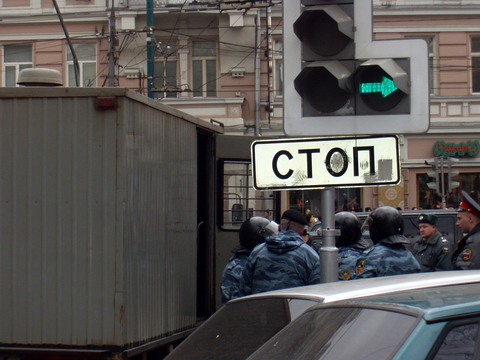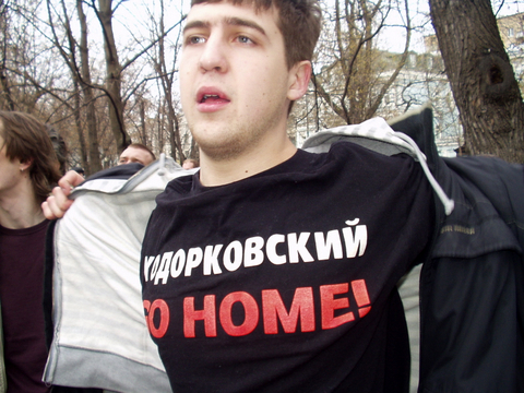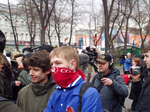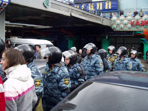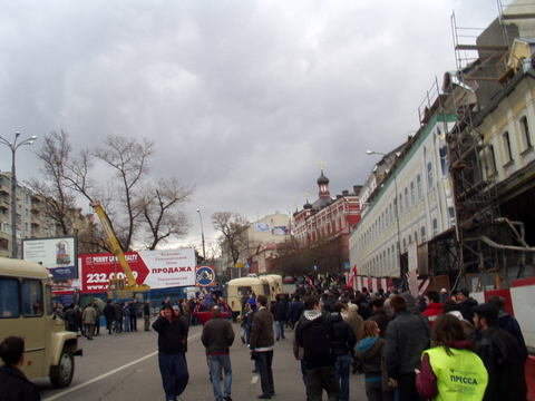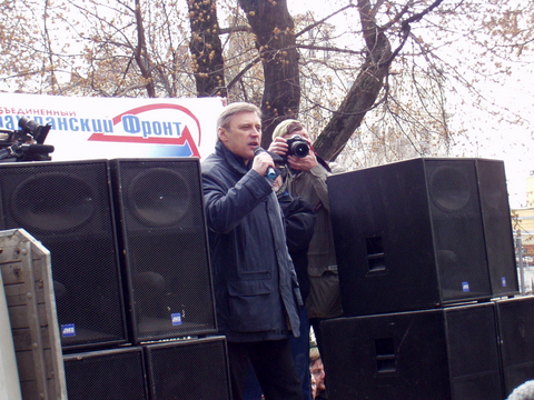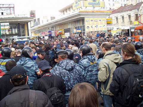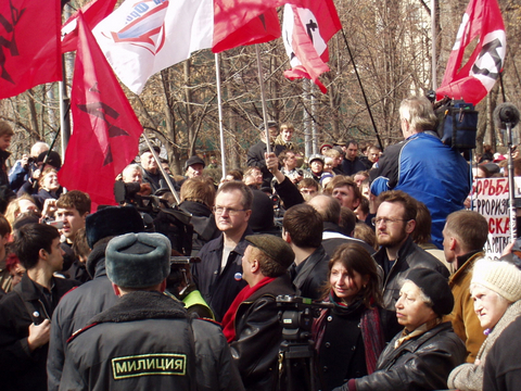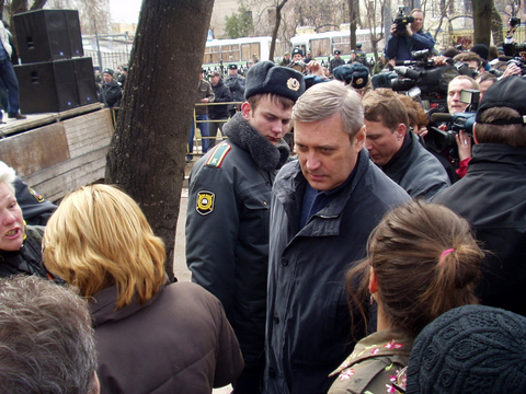 Касьянов выступает Митинг закончился, едва начавшись. Время кончилось через полчаса. ОМОН стал вытеснять людей к метро. Лимоновцы бросились вбок на прорыв. Маевка заканчивалась.