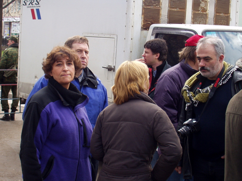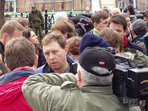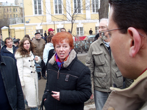 Лена Дикун собирает журналистов, чтобы идти на Петровку, 38 На подъеме от Трубной колонну обогнали четыре автобуса с ОМОНом. Оттуда выскочили бойцы и бросились крошить колонну.