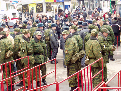 Касьянова проводят через оцепление к трибуне Мы же добрались до Тургеневской, наглухо оцепленной солдатами и милицией. Пропустили через металлоискатели.