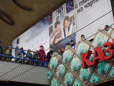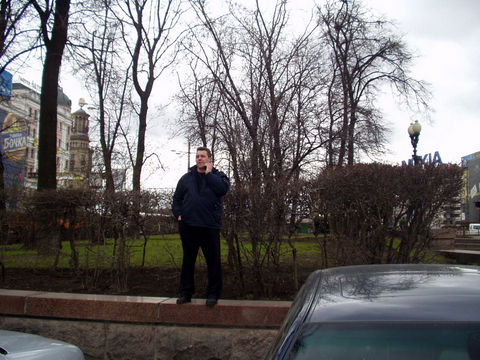 Леня с людьми на балконе кинотеатра, мальчика в красном потом схватит ОМОН Постояли около бывших «Московских новостей». Потом через подземный переход «Чеховской» вышли к «России». Всюду ОМОН, железные решетки, все перекрыто.