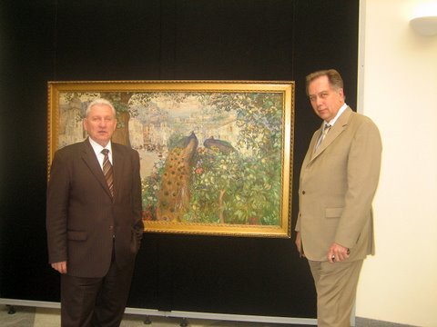 Министр Соколов и замдиректора ГМИИ Зинаида Бонами Время до фуршета мы с Галей решили переждать напротив, в музее частных коллекций, где открывалась выставка русской живописи из музей Ханты-Мансийского национального округа, она же легендарная Юрга, по которой в XVI-XVII веках сходили иностранцы, как по легендарной стране чудес. Но таковой она стала только недавно, как в ней отыскали и пустили в дело нефтедобычу. Лет 10-12 назад создали фонд отчислений для всего хорошего, в частности, решили скупать сначала иконы, а затем и русскую живопись XVIII-XX веков. Поскольку начали еще до дефолта 1998 года, то собрали много чего хорошего – из частных коллекций, с аукционных торгов. Брюллов и Кипренский, Айвазовский и Боголюбов, Поленов и Ярошенко, Суриков и Бурлюк, Малявин и Сомов. Гале показался подозрительным Нестеров 1934 года – будущий лауреат Госпремии пишет в 1934 году «Отцы-пустынники и жены непорочны»? Да и картина странная. Но собиратель коллекции объяснил ей, что это авторское повторение картины из собрания дирижера Голованова, сделанное якобы для дочери и чуть ли не с разрешения Сталина. В общем, уговорили, но осадок остался. И Павел Кузнецов «В кошаре» 1913 года тоже подозрительный. Тут уж ничего не спрашивали. Только, увидев Петра Авена, пришедшего на вернисаж, решили, что, небось, он и продал им. Впрочем, это все, конечно, шутка, не более того.