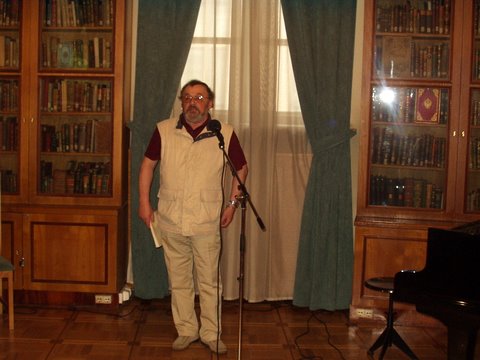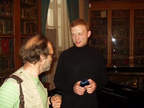 Юрий Веденяпин разговаривает после триумфального пения на идиш Впрочем, все окончилось оптимистично. Екатерина Гениева предложила возродить идиш, а для начала заставить губернаторов создать фонды для распространения издаваемой еврейской литературы в библиотеках. Начать с какого-нибудь губернатора Саратова... – «Тогда это уже будет Сара-Тов», - возразил Асар Эппель. После чего вышел рыжий молодой человек Юра Веденяпин, сын Маши Веденяпиной, пригласившей меня на этот замечательный вечер, и спел, аккомпанируя себе на гитаре множество замечательных песен на идиш – заканчивая колыбельной и тум-балалайкой. Не случайно он преподает идиш в Гарвардском университете. После чего все направились разговаривать к накрытым столам, но мы съели разве что с десяток пирожков и груду черешни с парой пакетов сока да и пошли себе домой, что мы, обжоры, что ли. Мы не обжоры, мы толерантные светские люди. |